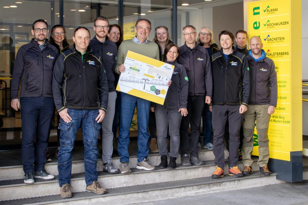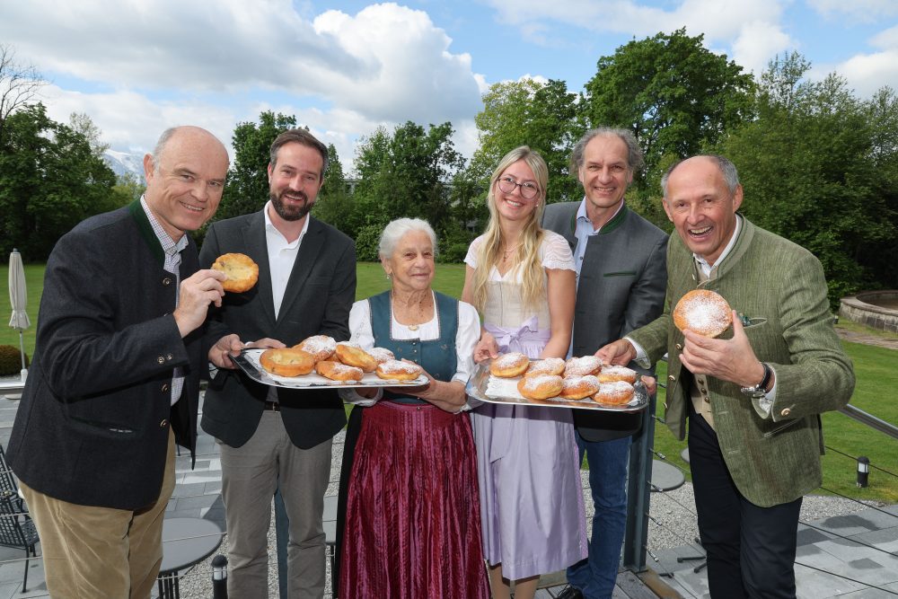 "Hoch die Alm!": Präsentation der SalzburgerLand Sommerkampagne 2024. Im Bild v.l.: Rudi Obauer, Landeshauptmann-Stv. Stefan Schnöll, Maria Gruber, Sophia Jäger, Andreas Jäger (3 Generationen von der Muhreralm im Lungau) und Leo Bauernberger (Geschäftsführer SalzburgerLand Tourismus).Start in die Sommersaison 2024. ©SalzburgerLand Tourismus