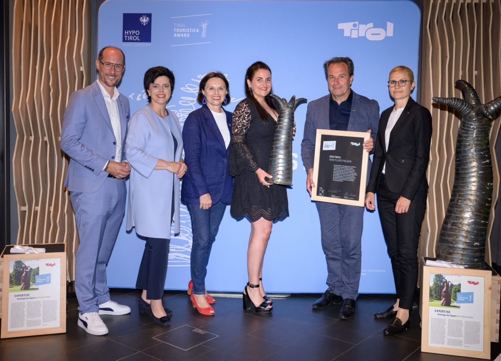Tirol Touristica-Preisträger und Iseltrail-Initiator Franz Theurl (Obmann TVB Osttirol) und Nachwuchspreisträgerin Anna Servis (Restaurant milsano, 2. u. 3. v.r.) mit Tourismuslandesrat Mario Gerber, Tirol Werbung-Geschäftsführerin Karin Seiler, Staatssekretärin für Tourismus Susanne Kraus-Winkler und Hypo-Vorstandsmitglied Susanne Endl (v.l.). © Tirol Werbung / Franz Oss