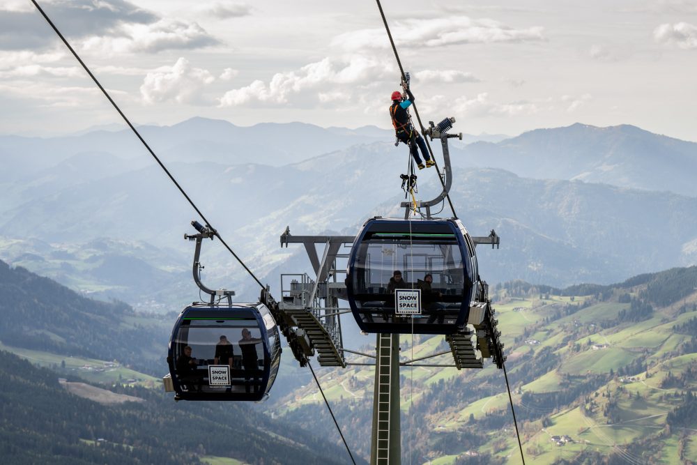 Die diesjährige Übung wurde an einer der neuesten Gondelbahnen im Snow Space Salzburg, der Flying Mozart in Wagrain, durchgeführt. Diese Anlage bietet durch ihre Modernität ein Höchstmaß an Kontrolle und Information im Ernstfall. Zusätzlich zu den herkömmlichen Durchsagen an den Seilbahnstützen gibt es spezifische, mehrsprachige Ansagen direkt in den Kabinen, was den Gästen in Notsituationen eine kontinuierliche Information und Beruhigung bietet. Auch bei einem Stromausfall bleibt die Kommunikation dank Notstromversorgung aufrecht. Zudem erfassen Belegungssensoren in jeder Gondel präzise, wie viele Personen sich in den einzelnen Abschnitten der Bahn befinden und eine Kamera liefert Live-Standbilder aus den Kabinen, was im Ernstfall eine noch effizientere Evakuierungsreihung – Kinder oder ältere Personen vorrangig – ermöglicht. Auch die Temperatur kann für jede einzelne Kabine überwacht werden. Diese Information ist besonders während der heißen Sommermonate von großer Bedeutung.