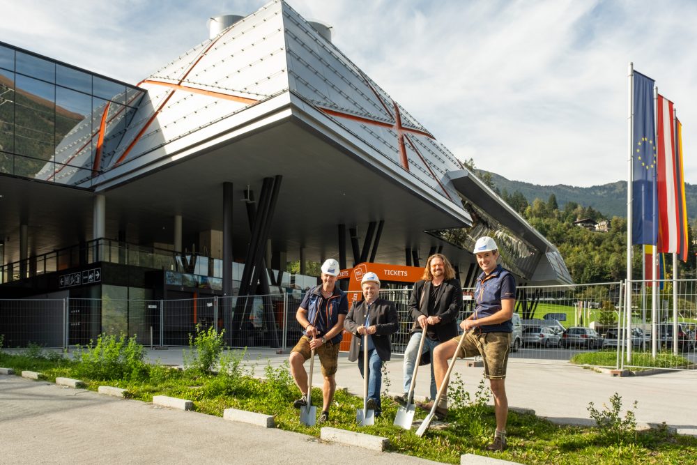 Spatenstich für den Solarpark Schlossalm Talstation (vlnr.): Christian Hochreiter (Betriebsleiter Schlossalm), Markus Viehauser (Bürgermeister Bad Hofgastein), Arch. Dipl.-Ing. Hendrick Innerhofer (Architekturbüro Innerhofer oder Innerhofer) und Ing. Andreas Innerhofer, MSc (Vorstand Gasteiner Bergbahnen AG). © Gasteiner Bergbahnen AG