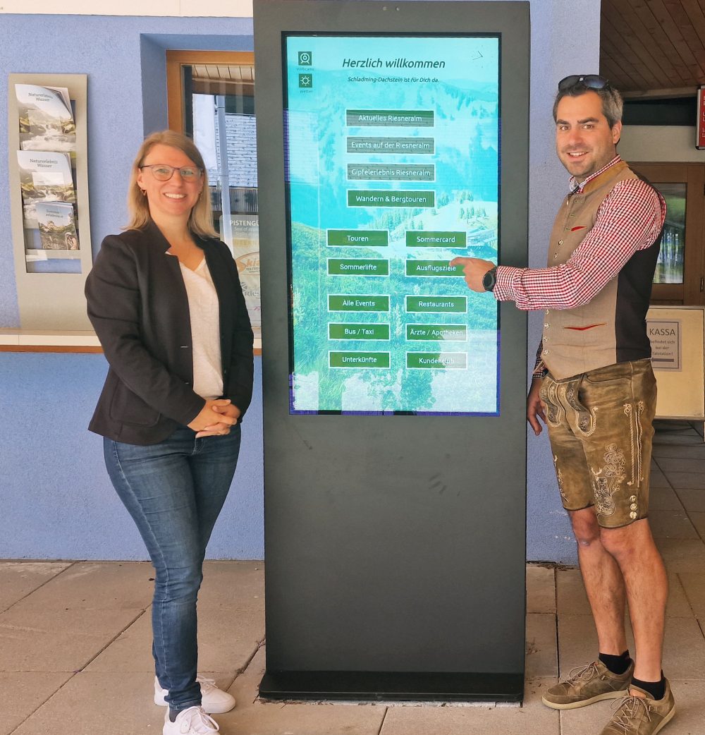 Medieninhalte aller Art, die sich an ein größeres Publikum richten, erreichen mittels Digital Signage ein besonders hohes Maß an Aufmerksamkeit. Im Bild: Carolin Lang, Leitung Digitale Services und Michael Schütz, Leitung Gäste- und Vermieterservice, vom TVB Schladming-Dachstein. ©Tourismusverband Schladming-Dachstein