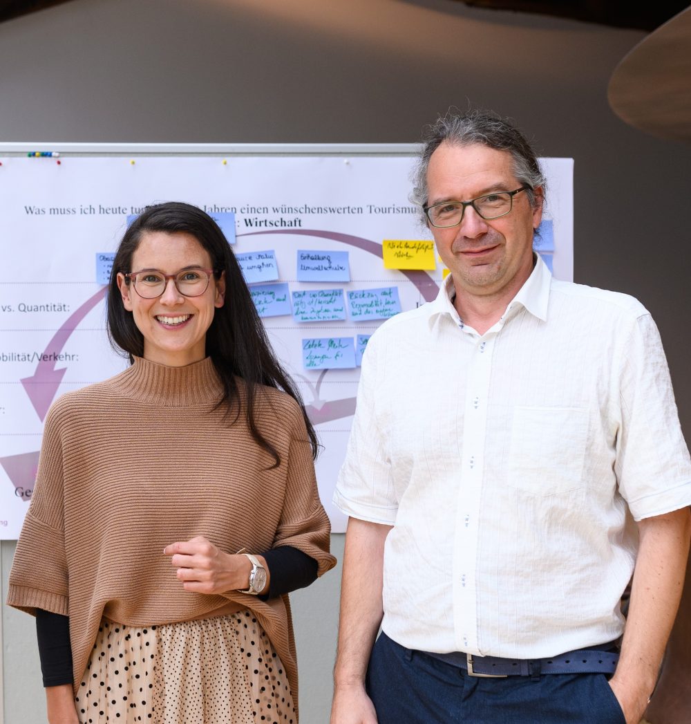 ) Theresa Haid (GF Vitalpin) mit Christian Baumgartner (Vize-Präsident CIPRA International) bei einem der Workshops zum Thema "Tourismus mit Zukunft".