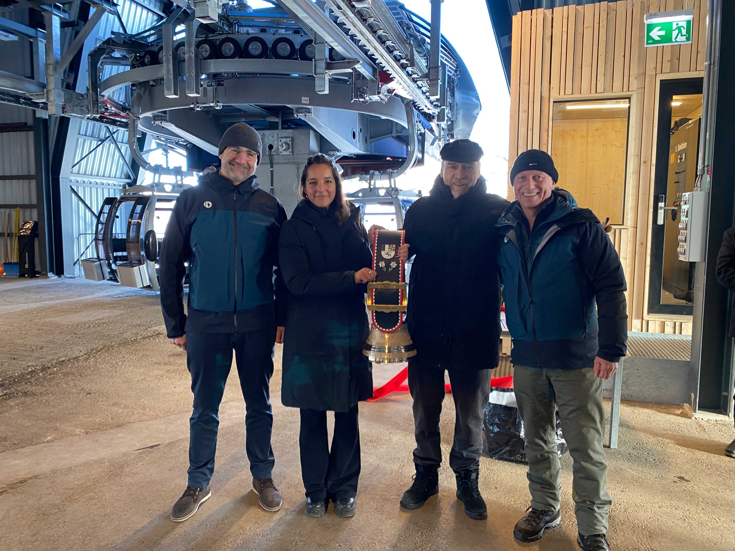 V.li.n.re.: Arno Inauen (CEO Garaventa AG), Alicia Martinez (Leiterin Bauprojekte der Weisse Arena Bergbahnen AG), Reto Gurtner (Verwaltungsratspräsident der Weisse Arena Bergbahnen AG) und Ueli Sutter (Projektleiter Verkauf Garaventa AG). © Garaventa AG